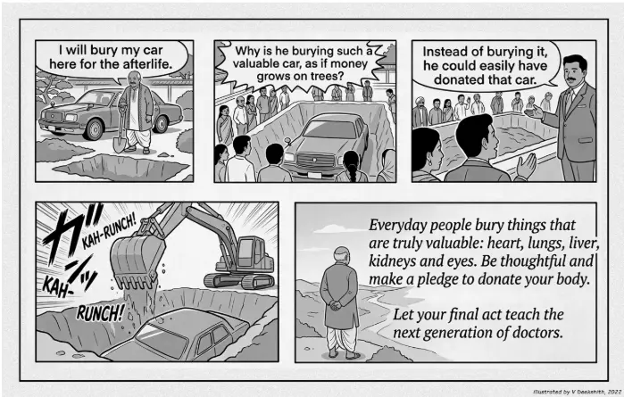Such donations are greatly needed, and this gift will be respected and valued by the medical community. The Department of Anatomy at the Kakatiya Medical College, Warangal, is dedicated to excellence in teaching and research, and the body donation program plays a vital role in this effort. We thank you very much for this kind thought.